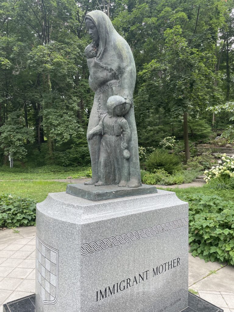 Flowing between the Croatian Cultural Garden’s upper and lower levels is a waterfall that symbolizes the many waterfalls in Croatia, particularly in Plitvice Lakes and Krka Falls. The lower garden walkway is heart-shaped like the “licitar,” which is a popular symbol in Croatian folklore. In its center is the Immigrant Mother statue, sculpted by Joseph Turkaly, a Croatian-born Cleveland artist. The base of statue includes the Croatian Glagoltic alphabet, along with a Grb, or the Croatian shield.