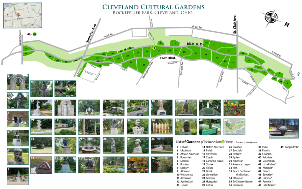 The Cultural Gardens are located within the City of Cleveland’s largest public park, Rockefeller Park. The gardens run along East Boulevard and Martin Luther King Jr. Drive, between the city greenhouse in the north and Wade Park Avenue at the southern end (a stone’s throw from the new Jesse Owens Olympic Oak Plaza). The Chinese Cultural Garden is also on MLK Jr. Drive but farther south, part of the Nord Family Greenway by the Cleveland Museum of Art.